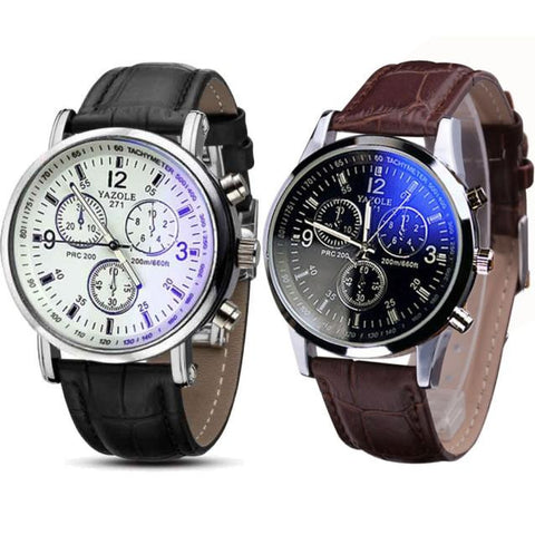 2PC Luxury Fashion Faux Leather Mens Blue Ray Glass Quartz Analog Watches
